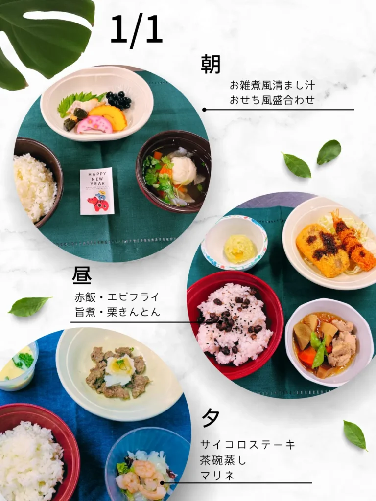 12月31日~1月3日の間、入院患者様にも年末年始の雰囲気を味わっていただけるよう特別メニーを提供いたしました。写真は常食ですが飲み込みに制限がある方も見た目が大きく変わらないように工夫しました。